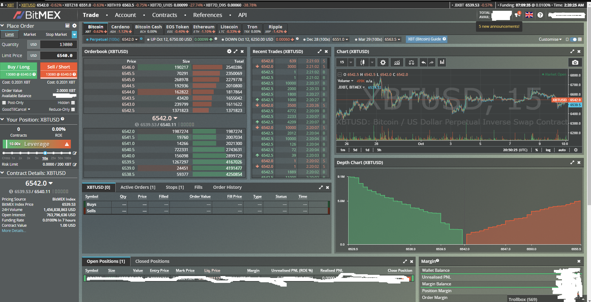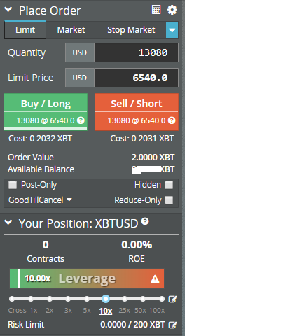 Set-up to buy 2 Bitcoin ($13080) with 0.2 BTC ($1,308) Margin i.e. 10x Leverage Long