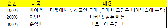 - 니아박스가 에어드랍 받은 코인은 아래와 같이 사용된다.