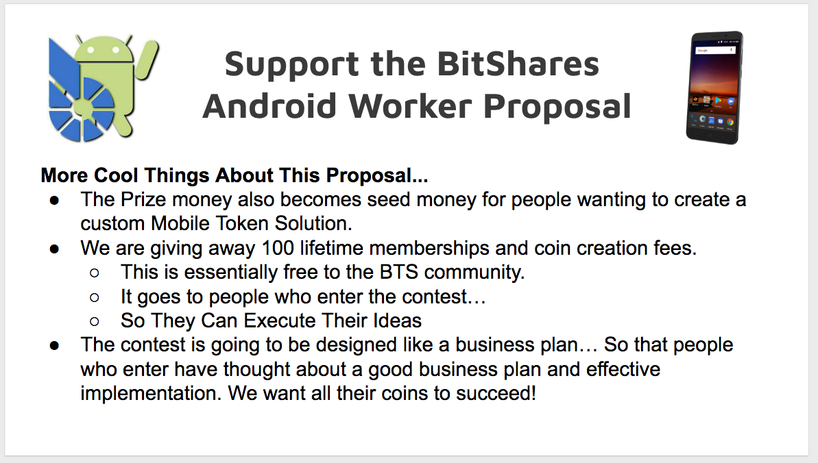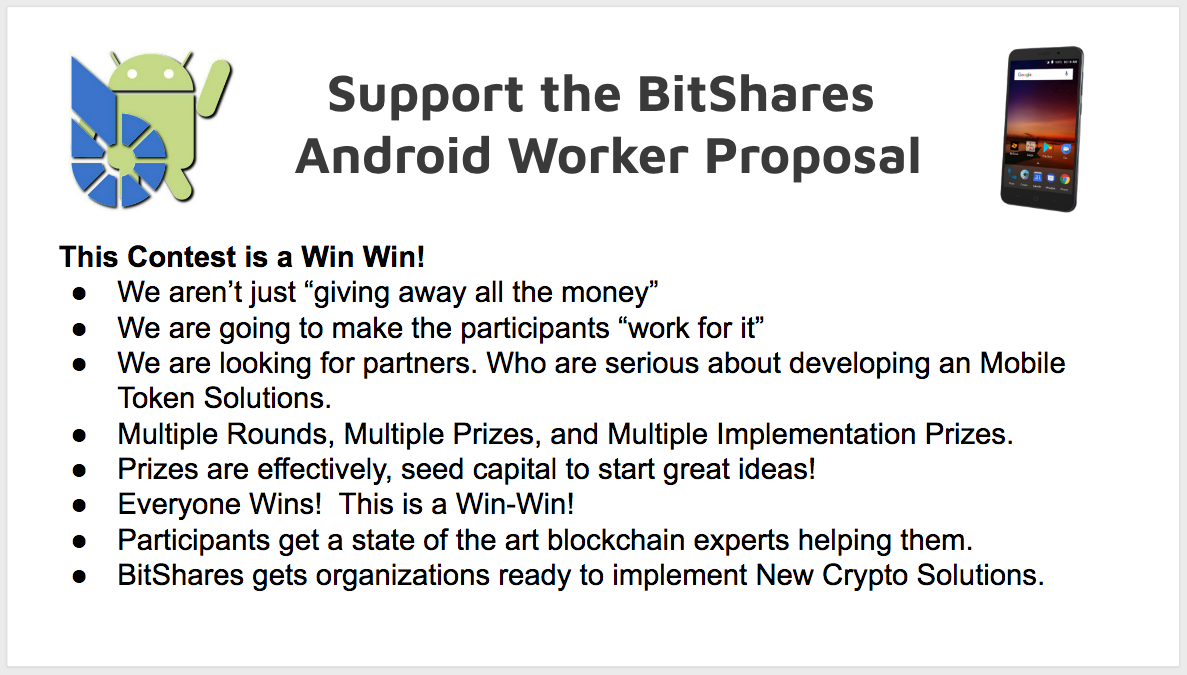 Help take the strengths of BitShares from computers to mobile putting them into the hands of people on the move. A group of BitShares enthusiasts proposes to create a BitShares Android Customer Token Wallet. This is a comprehensive worker proposal to engage the community in a $150,000 contest for the best uses of a mobile custom token wallet.