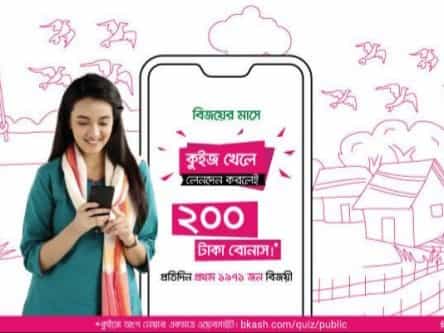 কুইজ প্রতিযোগিতায় অংশ নিয়ে বিকাশ গ্রাহকরা সহজ তিনটি প্রশ্নের উত্তর দিয়ে পেতে পারেন ৫০০ টাকা পুরস্কার। ১৪ থেকে ৩০ সেপ্টেম্বর পর্যন্ত বিকাশের ওয়েবসাইটে এই কুইজে অংশ নিতে পারবেন গ্রাহকরা। তবে এখনো এই অংশ গ্রহনের সুযোগ রয়েছে। এখন যদি অংশ গ্রহন করেন, তাহলে ২০০ টাকা জিতার সুযোগ রয়েছে।