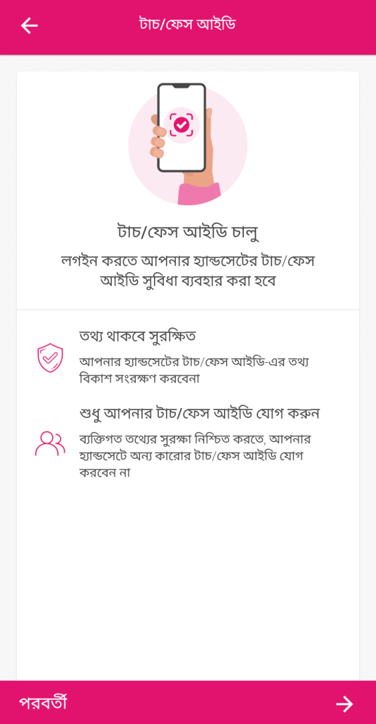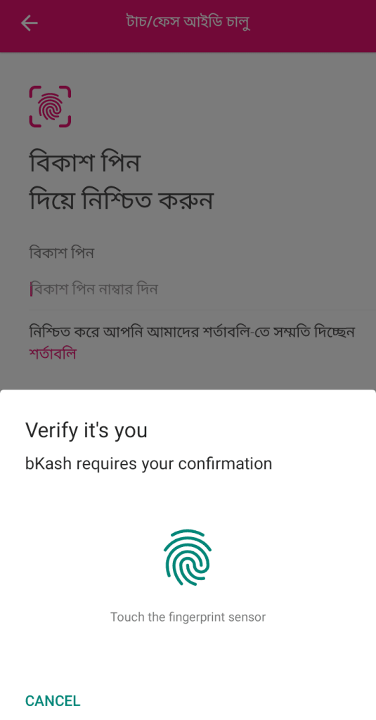 এরপর আপনার ফোনে ফিংগারপ্রিন্ট বা ফেস আনলক – যে সিকিউরিটি অপশন চালু আছে সেটি পপ-আপ হিসেবে প্রদর্শিত হবে। ফেস আইডি বা ফিংগারপ্রিন্ট ব্যবহার করে ভেরিফাই করলে বিকাশ অ্যাপে ফেস আইডি বা টাচ আইডি যুক্ত হয়ে যাবে।