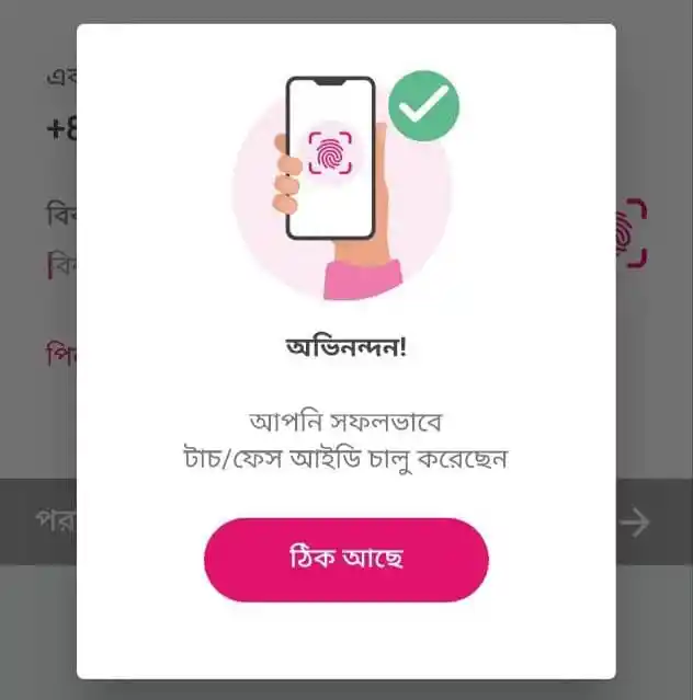 সফলভাবে বিকাশ অ্যাপে ফেস আইডি বা টাচ আইডি লগিন ফিচার যুক্ত করার পর অভিনন্দন লেখা দেখতে পাবেন।