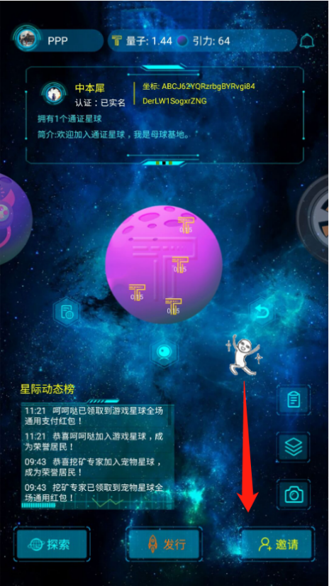 点击主界面右下方的邀请按钮,进入邀请界面,发送邀请码给好友,即可邀请好友与你一起探索星球奥秘