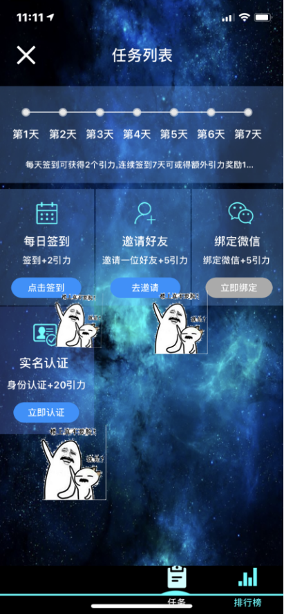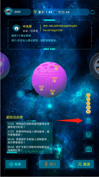 进入任务界面,即可看见不同任务的领取按钮,获得的引力值越多,对于星球开采的速度越有帮助,更有不定期神秘任务可能赢得通证量子哦