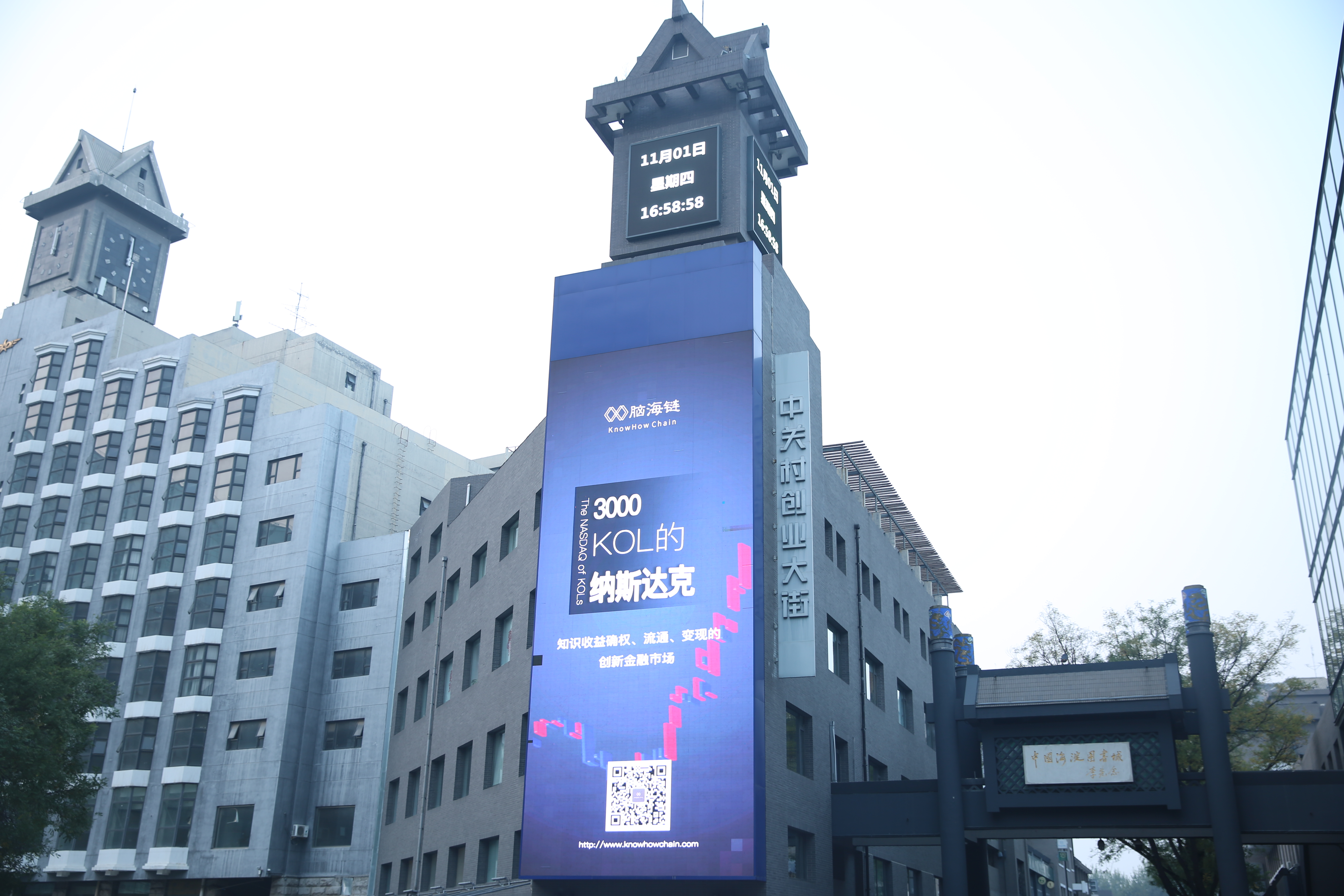 11月1日,中关材创业大街的大屏上赫然显示"3000 KOL 的纳斯达克,脑海链打造知识投资的创新金融市场"