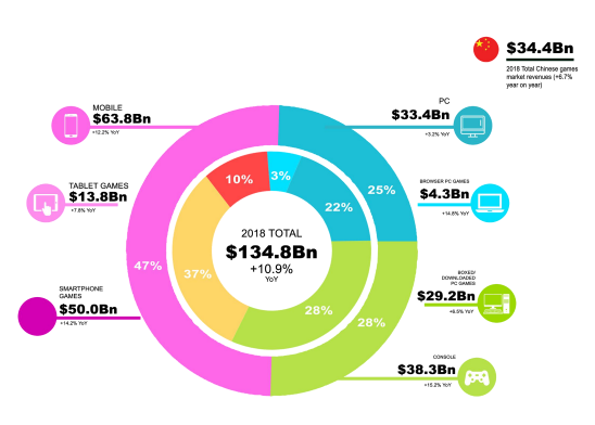 The overall global gaming market, was estimated to be worth around $135 billion in 2018. The largest sector of this massive figure is attributed to mobile gaming, estimated at around $63 billion, taking an impressive 47% share.