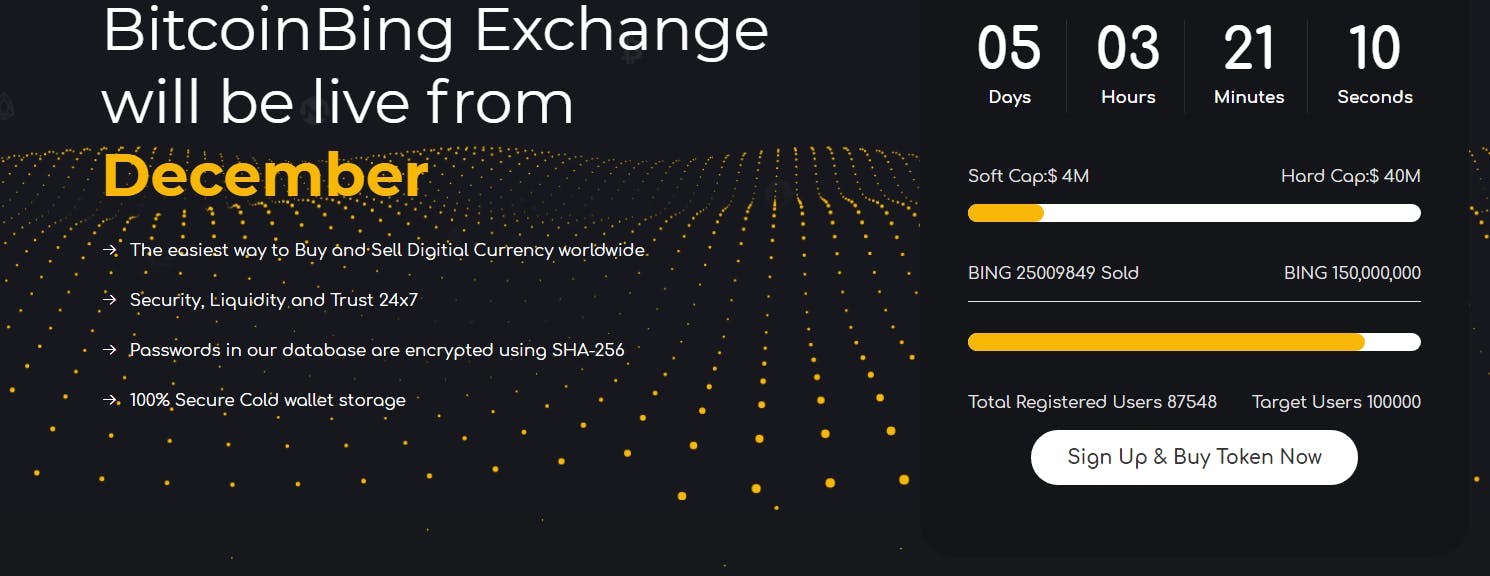 Bing token is the exchange native utility token which gives it holders an opportunity to trade at zero transaction fees. The token will also be used to pay for services which includes revenue sharing, using it to trade other cryptocurrencies, unique way in portfolio diversification.