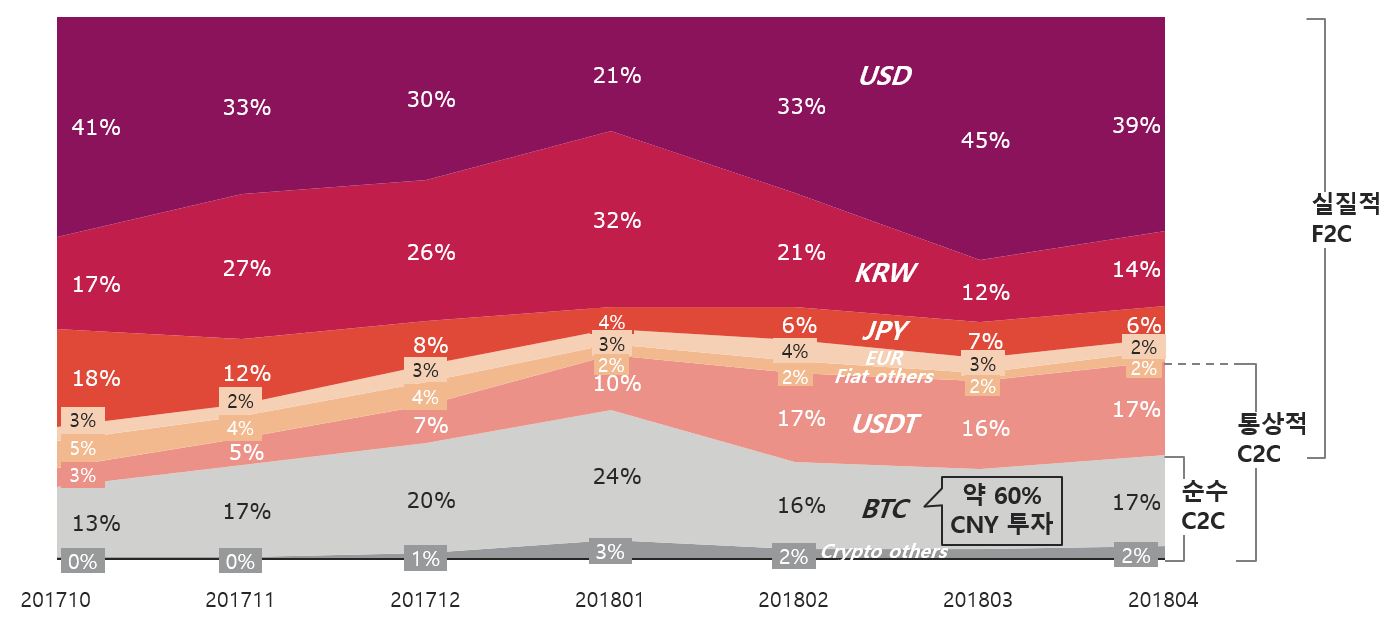 나아가, 2018년 4월 BTC 마켓이 17% 수준을 차지하고 있으나, 이중의 60%는 2017년 중국에서 CNY 거래를 금지하여 유입된 CNY 물량으로 추정된다. 이를 감안하면, 실질적인 C2C 마켓은 더욱 작을 것으로 추정되며, 그마저도 상당히 많은 국가와 거래소로 구성되어 Fragmented되어 있다고 보면 된다.