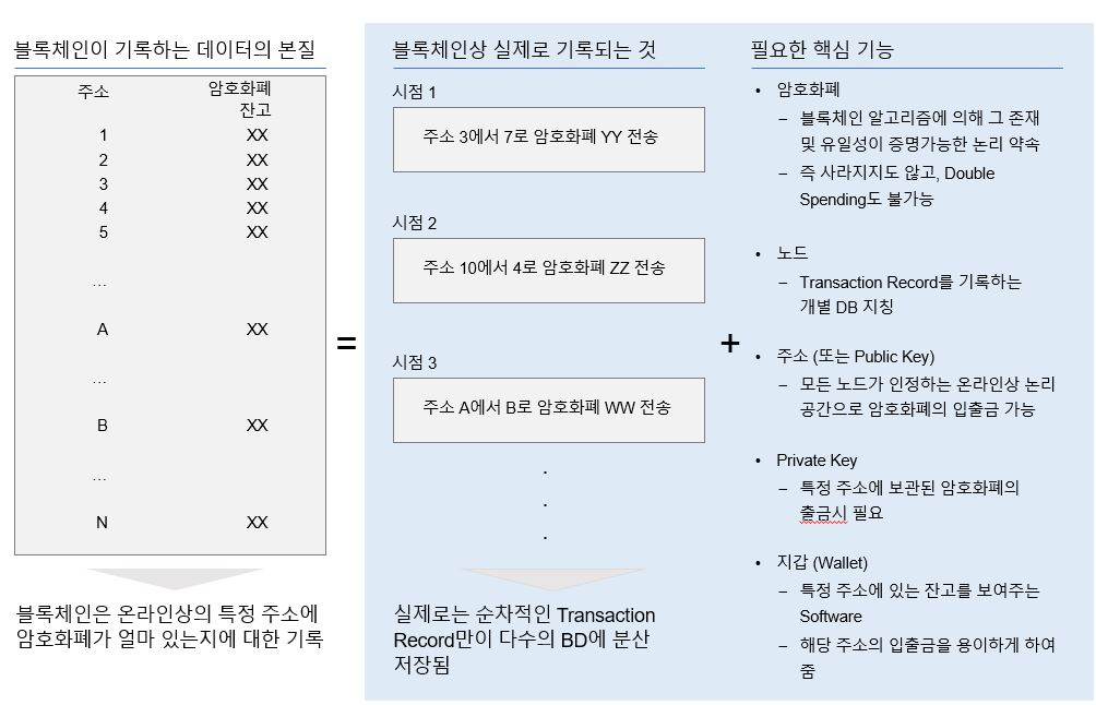 한편, 블록체인상 실제로 기록되는 것은 특정 시점에, 특정 주소에서 또 다른 주소로 얼마의 암호화폐가 전송되었는지에 대한 기록이다. 이를 Transaction이라고 하며, 일정 개수의 Transaction이 묶여진 것이 Block이다. 그렇다면 암호화폐는 무엇인가? 암호화폐는 블록체인 알고리즘에 의해 그 존재 및 유일성이 증명가능한 논리약속으로, 사라지지도 않고 Double Spending도 불가능한 논리수량이다. 특정주소와 연관해서만 생각할 수 있다.