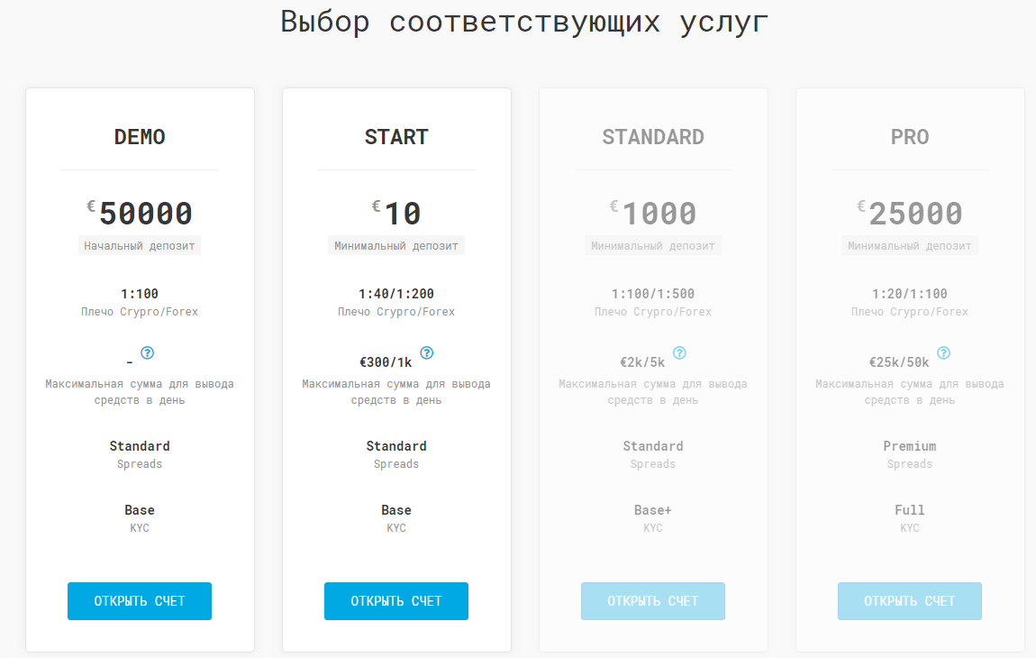 - Standart. Самый меленький депозит составляет 1 000 евро. Лимит для вывода денег происходит автоматически, составляя 2000\5000 евро.