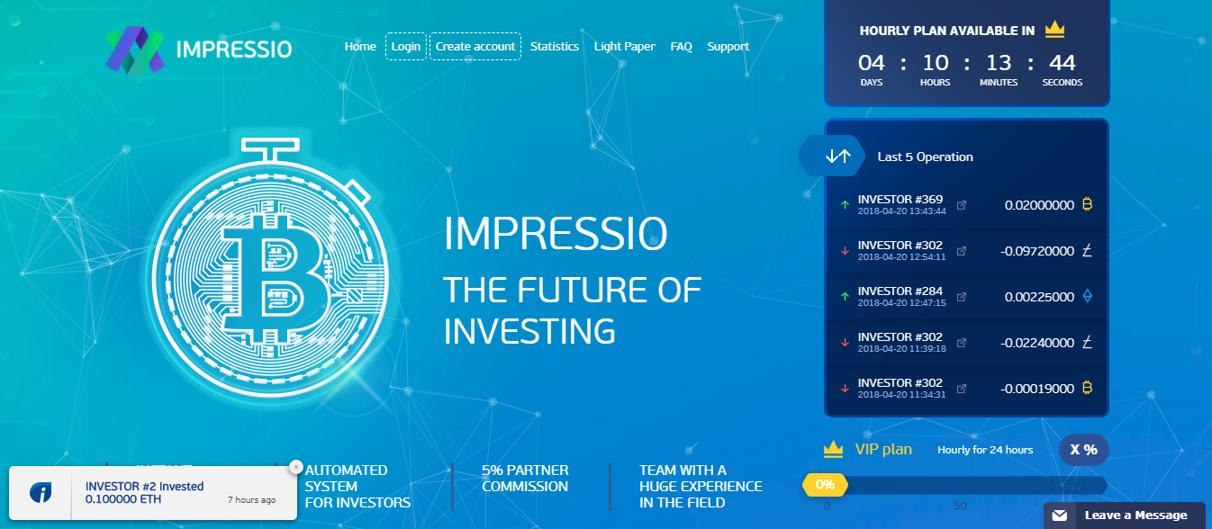 Impressio is a decentralized Crypto Investment and Lending platform whose aim is to create a friendly environment for cryptocurrency holders, trader, and enthusiasts by using a decentralized mode of operation ( Blockchain ).
