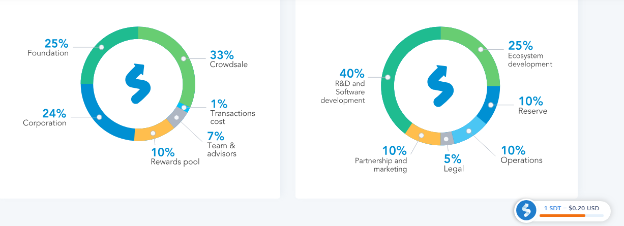 На данный момент проходят публичные предварительные продажи монет или Pre-sale. За это время инвесторы со всего мира могут принять участие в продажах токенов и купить их в необходимом количестве, инвестировав в проект. Монеты продаются под названием SDT. Установлена фиксированная цена в $0,14. После стоимость будет повышена до $0,2. На данный момент инвесторы могут купить токены по приемлемой цене. В последствии цена будет повышаться до 20$. Сегодня проект уже реализовал 43,4 млн монет. До окончания первого этапа продаж надо продать ещё 26,6 млн токенов. Основная цель публичного Pre-sale – продать 70 млн монет. После данного этапа проект ставить цель в реализации 161 млн токенов.