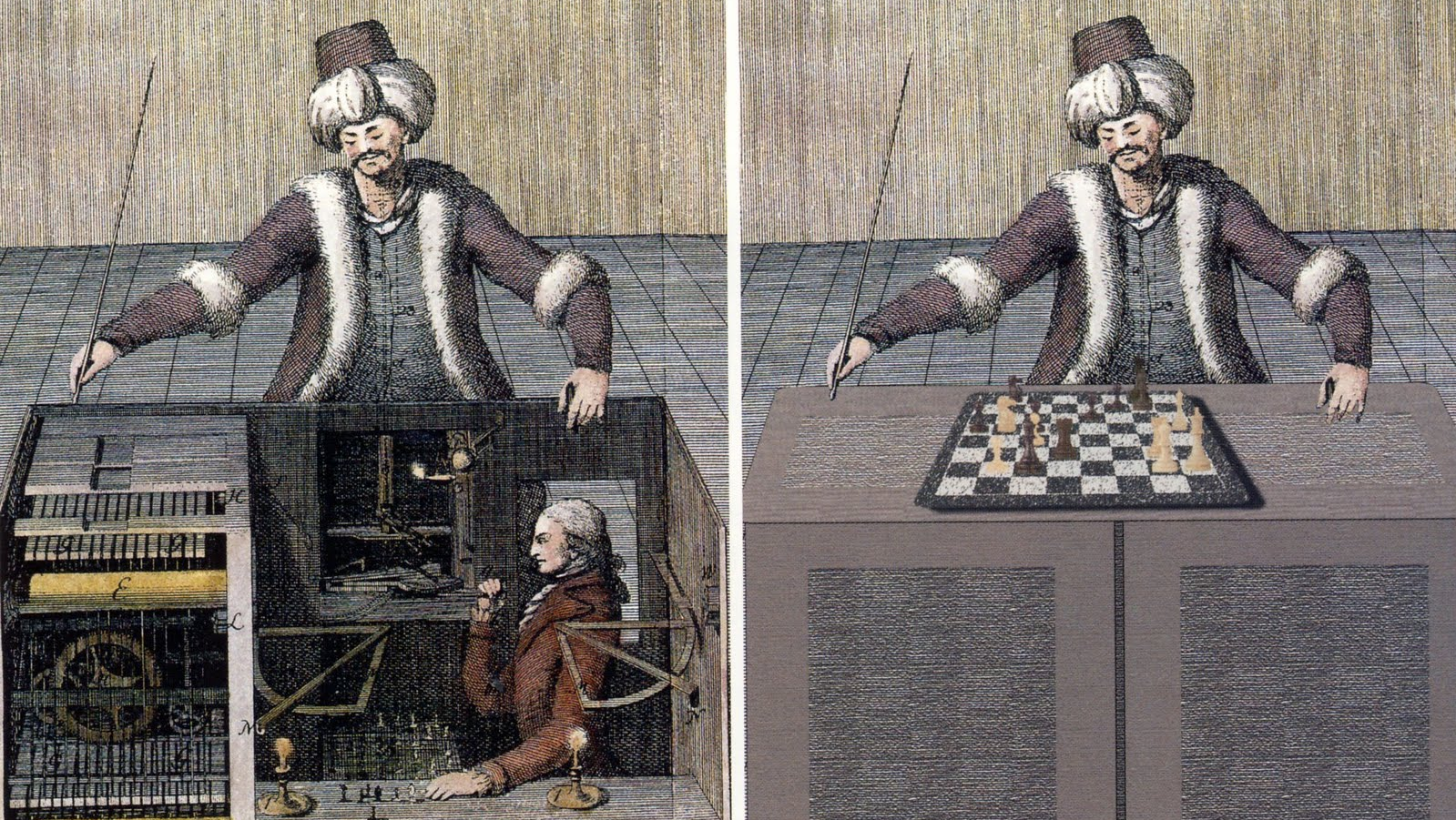 My personal favorite attempt of robotics was the Mechanical Turk built by Wolfgang von Kempelen, which was basically designed to be a robot that could play a strong game of chess. During the late 18th and 19th century this machine toured all over Europe and defeated many challengers including Napoleon Bonaparte and Benjamin Franklin. Eventually the Mechanical Turk was revealed to be a hoax, with a real human chess master being hidden inside the compartment and operating the machine.