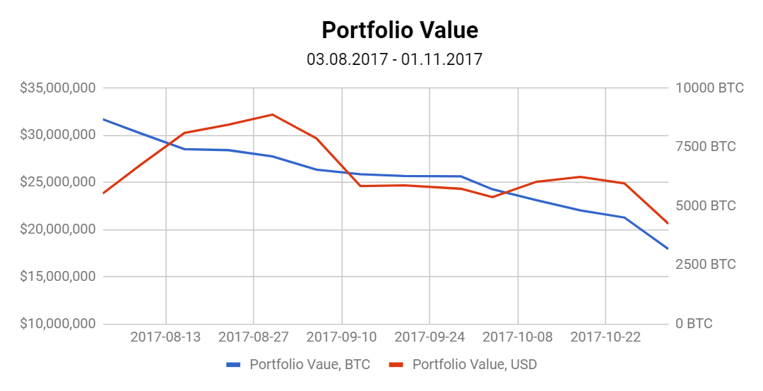 Price of SPIES token grew by 5.87% since the latest report of 25 October, 2017 was published. The share of top 5 portfolio assets in the portfolio constitutes 72.36%. Bitcoin’s price increased by 17.74%. The price of Ethereum decreased by 0.36%, Tezos gained 17.74%, EOS grew by 53.27% and Cosmos increased by 17.74%.