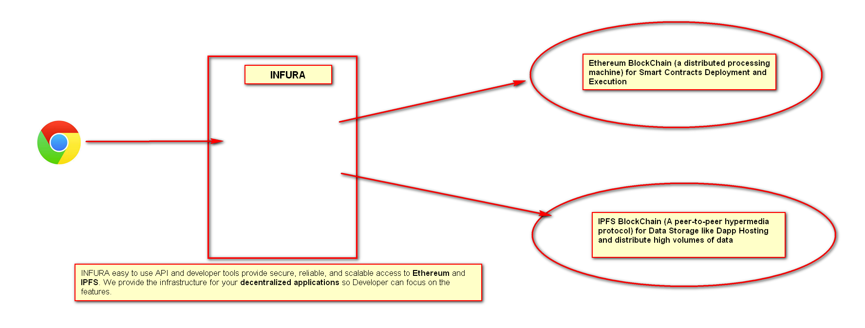 Before ending on the section I would like to give an overview of a service called infura which fills the infrastructure gap for developers so that Developer can focus on applications core features. For more details references are provided.