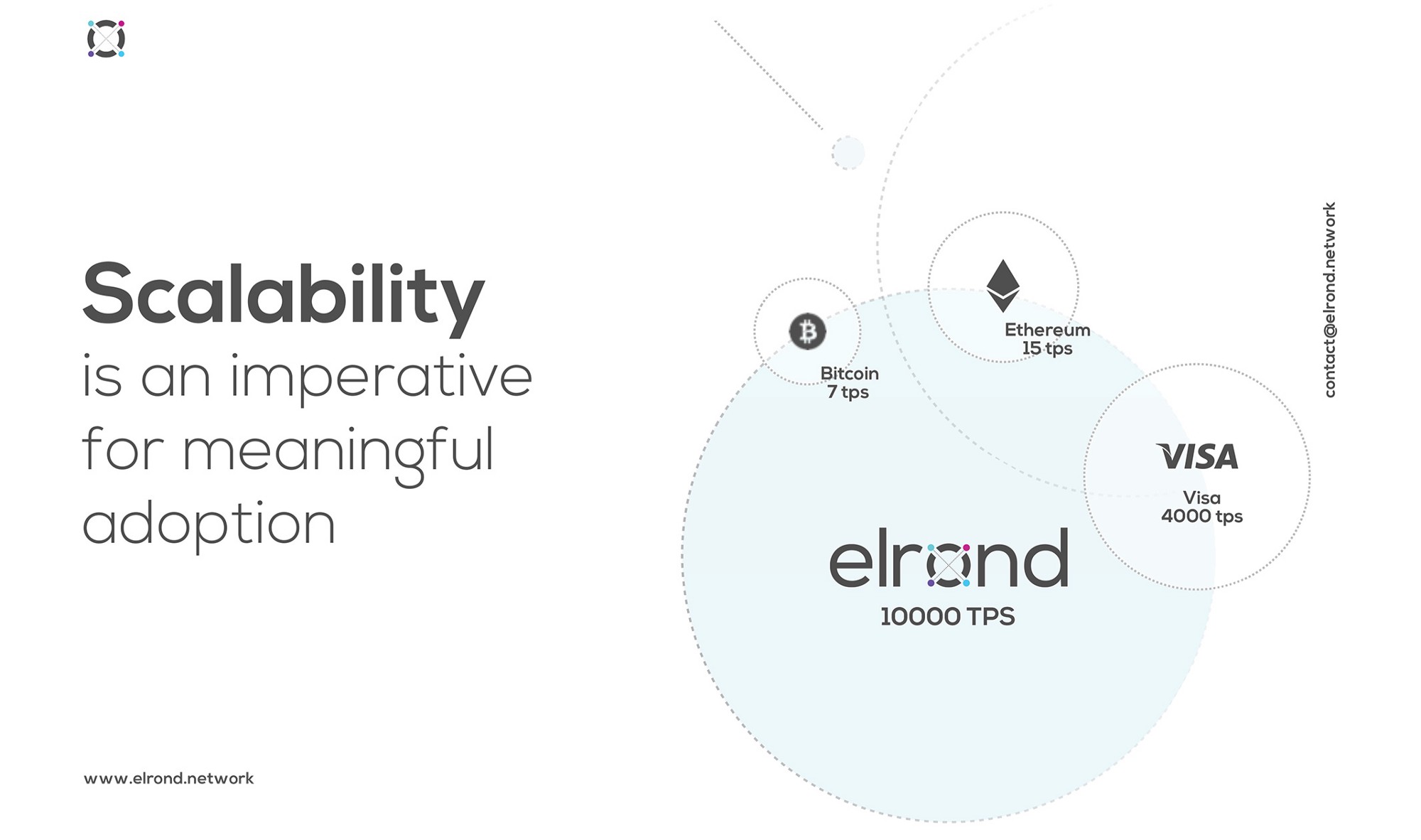 Elrond is a complete rethinking of public blockchain architecture, solving scalability through adaptive state sharding, efficiency through secure proof of stake, and will enable EVM compliance by design. Elrond attempts to bring a 1000x improvement compared to current status quo, aiming for 10,000 TPS, low latency, and minimal fees.