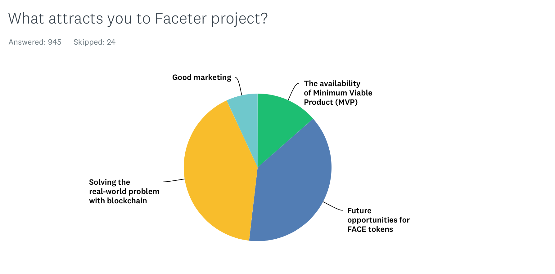 38% of the total number of votes is for the future potential of the Faceter token. And here again, we are not going to fail you. We are aimed at listing on all popular exchanges as soon as they give us a green light. We are sure that with your support it will not take long. That is why the next few listings have already been planned for the summer.