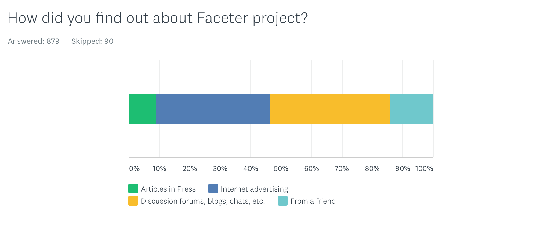 Special thanks to those who found time to share about Faceter to their friends and colleagues. More than 14% of respondents found out about the project from their friends.