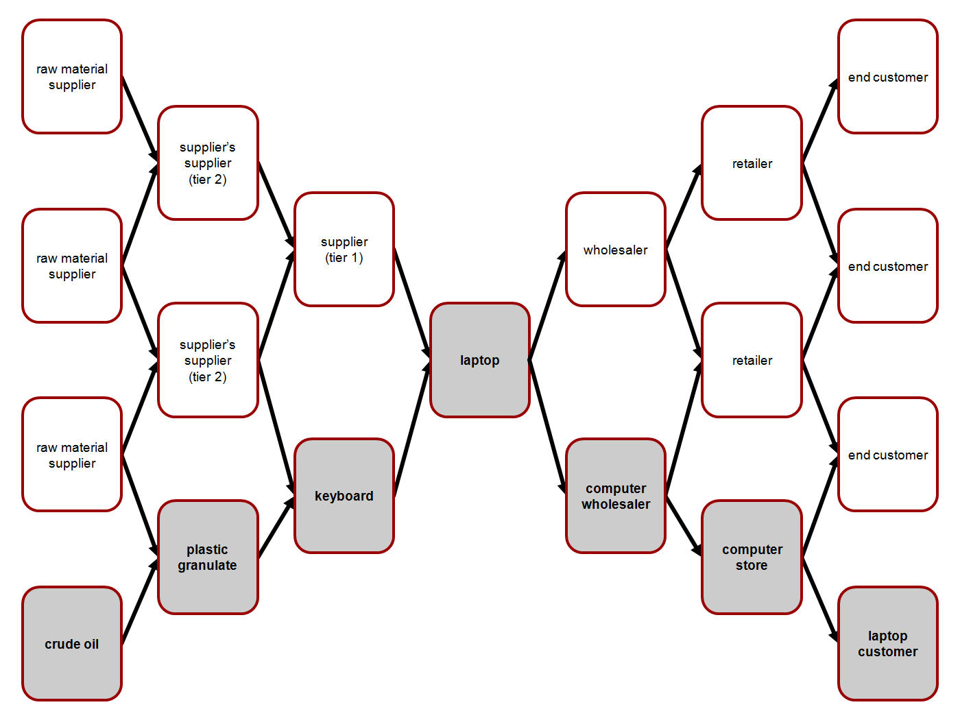 The picture shows the manufacturing process of the laptop. The left side shows the raw material supply side for manufacturing a laptop computer, and the right side of the “laptop” shows the demand side which contains multiple roles such as wholesalers and retailers. The multiple roles combines together and forms the supply chains built around laptops.