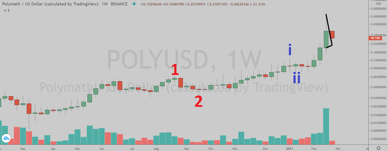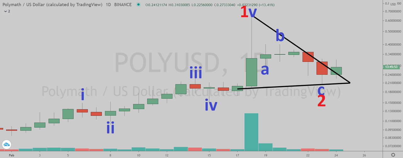Zooming out in the weekly chart, I believe POLY is currently in the red wave three (blue sub-wave iii). The red wave one began on March 13, 2020 and the red wave two correction ended on September 24, 2020.