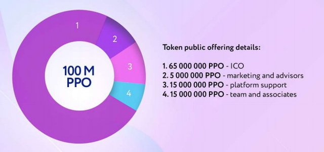 65 million PPO bucks are offered for sale with ICO. 5 million PPO is devoted to marketing efforts and consultant payments. The platform will be supported with 15 million PPO. 15 million PPO is reserved for the team. A total of 100 million PPO will be printed.