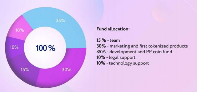 35 percent of the fund collected is devoted to project developments and PP coin fund. A large part of 30 percent is reserved for marketing and the first product to be coinulated through the platform. 15 percent to the team, 10 percent for legal support, while another 10 percent for the technological support reserved for the slice.