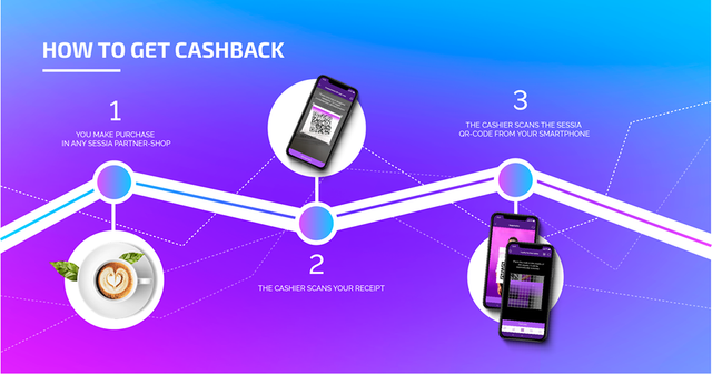 Customers use the Sessia application to find stores and offline companies affiliated with Sessia, make purchases, receive cashback and kickback, share receipts, likes, and comments on Feeds. Sessia automatically posts information about the transactions made on the Feed and allows consumers to access information about products purchased by their friends.