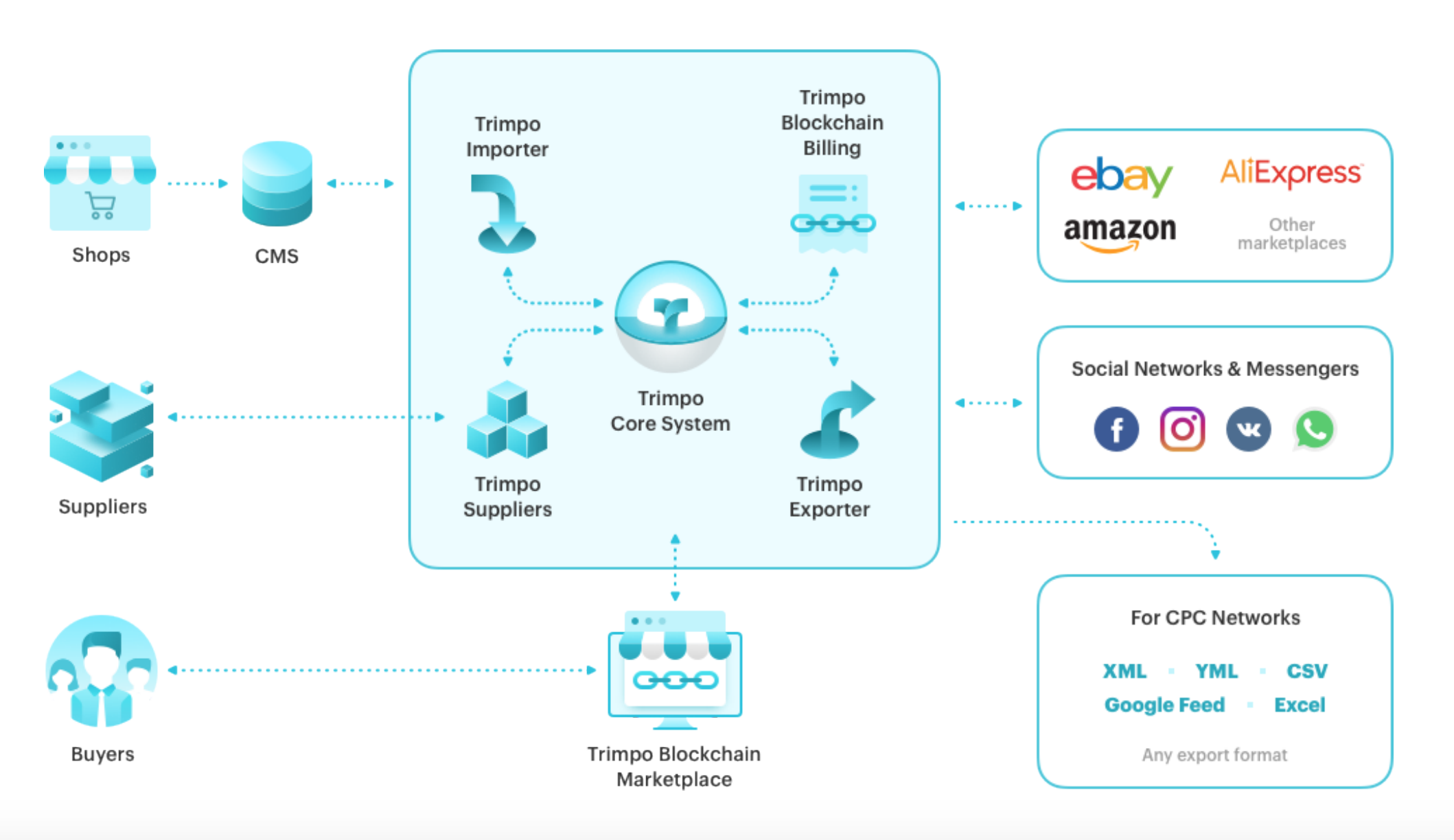 The Trimpo project sets an ambitious goal: to combine all the platforms for online trading, providing sellers with access to all goods and services in a single application based on blockchain.