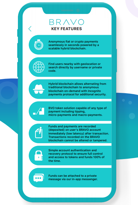 Hybrid blockchain will alow alternating from traditional blockchain to anonymous blockchain on-demand with Incognito payments protocol for additional security. The BVO token solution capable of any type of payment including tipping, micro-payments and macro-payments; The funds and payments will be recorded (deposited) on user’s BRAVO account immediately (low latency) after transaction. The funds will and can be attached to a private message via our in-app messenger. The transactions recorded on the BRAVO blockchain cannot be altered or tampered; There will be a simple account authentication and recovery protocol to ensure full control and access to tokens and funds 100% of the time.