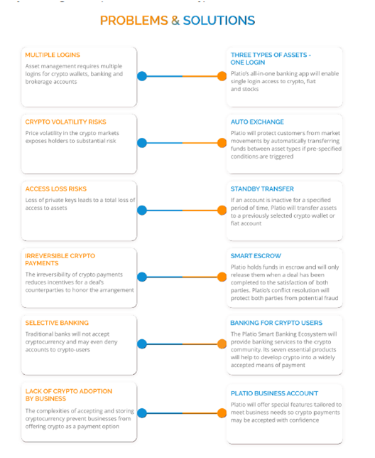 Platio is preparing a Smart Banking Ecosystem (“Platio Ecosystem”), whose objectives are to make cryptocurrency a widespread means of payment by increasing its utility. Platios is focusing on how to provide traditional financial services to the digital currencies community in a secure and compliant way. They believe that the global community needs a solution that takes the best features from both, new and traditional financial systems and gives the world economy an opportunity to embrace the growing digital economy.