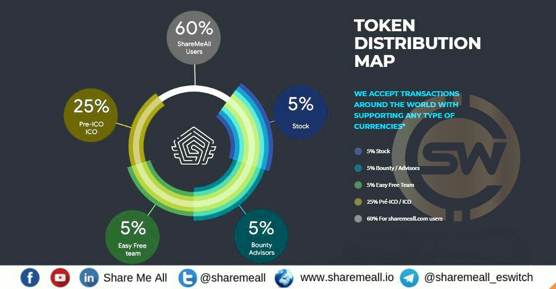 Any Sharemeall.com user will be able to buy Switch®. The starting price on our platform will be € 1 per eSwitch; By winning commissions on sale. Any company or organization will be able to use eSwitch® in their business model on the platform; By providing associated services within the community. Any service provider wishing to provide an associated complementary service within our platform will be able to integrate into the planned trading process and be paid by customers in eSwitch®; By using a good service. Any user of our sharemeall.com platform that uses the services of another user in our site will use eSwitch® as soon as the operation is complete. By converting it into another cryptocoin. Through their site, all sharingmeall.com platform users are able to transfer eSwitch® to a very simple cryptocurrency with just a few clicks. They will be immediately available in their wallet cryptocurrency. First, this way to turn this. By converting into cryptocurrency via bank account. By using the sharemeall.com platform, you will be able to convert eSwitch® into foreign currency according to the eSwitch® exchange rate. At the same time, he will be able to transfer to his account.