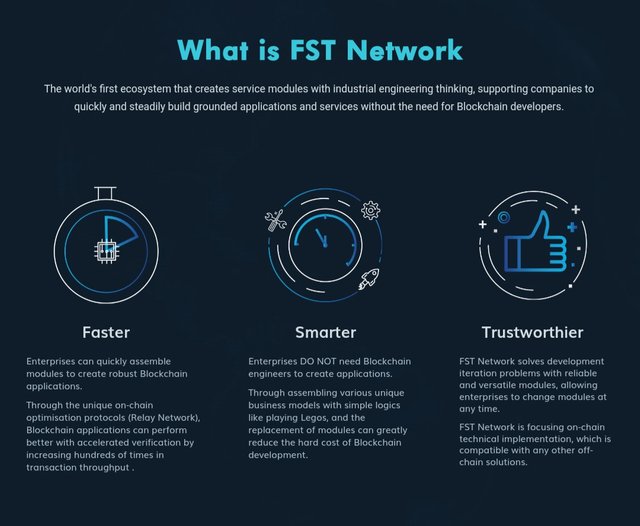 Trustworthier:- this platform provides a more reliable and solid model of modules of which it gives the organizations opportunity to switch any of the modules at any time they desired. With fst-network, you can be sure that you will have a more reliable services than anywhere else. There will off chain implementation and onchain services as well. Cheers.