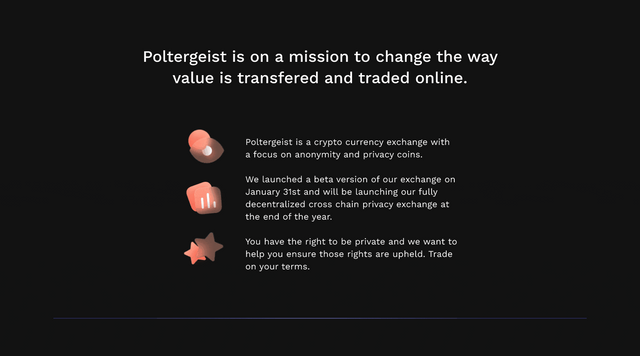 The Poltergeist Exchange is an exchange made specifically for privacy coins. They were launched a few days ago and still not onboard ONION, But basically Exchange without kyc is always good, because anyone can trade at their own risk control. But there is no need to worry because this platform is safe to use, transparent and another uniqueness is that traders are not charged transaction fees when transacting there. as I said that Poltergeist is a Crypto currency exchange With a focus on the anonymity and privacy of coins, including some of the features below: