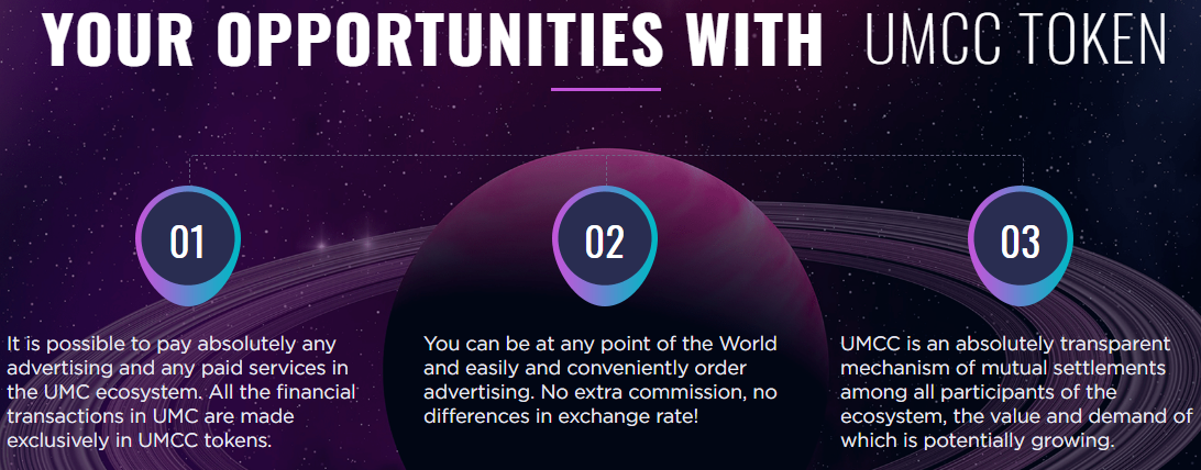 The UMCC Token (created in the Ethtereum block) will be the only internal payment tool on the UMC platform. These tokens can be purchased at all stages of ICO, in exchange after their listing or on an internal exchanger. The platform will withdraw the percentage of all transactions, and at the end of each quarter, 100% of the net profit will be sent to purchase UMCC tokens at market prices on the external exchanges. The tokens purchased will be burned, and the price plan, with emissions reductions, will increase.