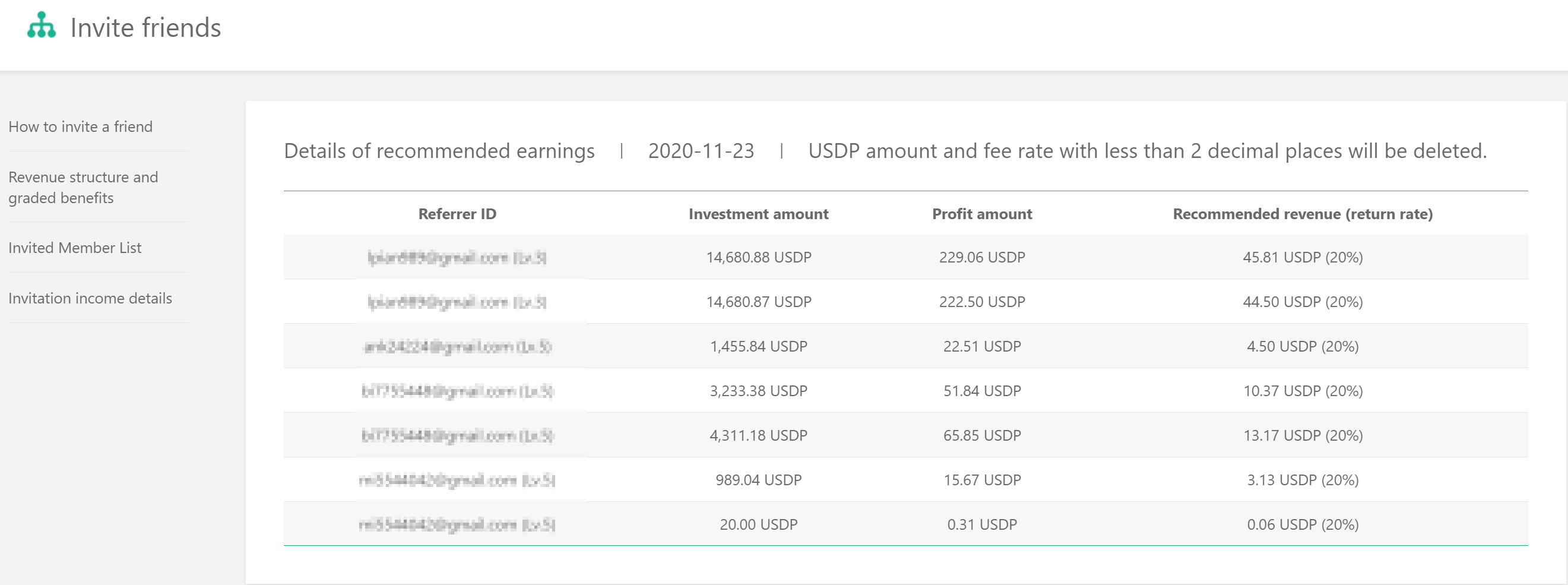 The ratio of the basic commission is 20%, 15%, 10%, and 5% in four levels. Multi-profit is 2%, 1.5%, 1% ,and 0.5% of recommended friends from your friends. There is no limit to the number of friends you can invite.