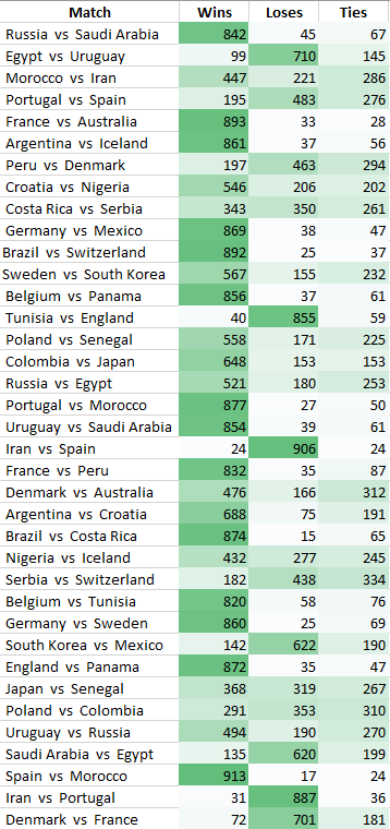 We analyzed 954 valid entries and most people (913) agreed that Spain beats Morocco (24 believe in tie), 906 people think Spain will win over Iran while 24 people believe in Spain's loss and 24 in tie), 892 trusts Brazil to win over Switzerland while 25 think Brazil will lose and 37 think it will end up with a tie. Win and loss in graph is from a view point of the first mentioned team.