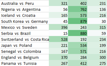 Collective opinion of a lot of people will often produce better result than an opinion of a single expert because false expectations of a single person are filtered by voice of others that have the right information. Let’s look at some examples: most people agree that Spain, France and Brazil will win all their matches, most people also agree that Saudi Arabia and Iran will lose all. 96 % of people think that Spain will beat Morocco and 95 % think that Spain wins over Iran. Only 2 % of people think that Costa Rica will beat Brazil which is extremely unlikely and since you get only 1 point if that happens, you should prefer to bet on more likely results where you can get the same 1 point much more likely. The hardest think to find in the data is separating teams that are on similar level like Serbia and Switzerland, Poland and Colombia or Japan with 39 % chance of win and Senegal with 33 % chance of win while 28 % likelihood of tie. We can do some tricks like removing people what believe that Costa Rica wins over Brazil but even that moves the percentages only slightly.