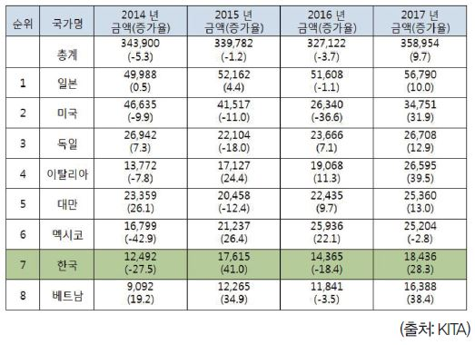 2017년 중국의 RFID 리더기 수입규모는 약 3억6000만 달러로 전년 대비 9.7% 증가했습니다. 그중 한국은 약 1800만 달러로 전년 대비 28.3% 증가해 수입상대국 7위를 차지했습니다.