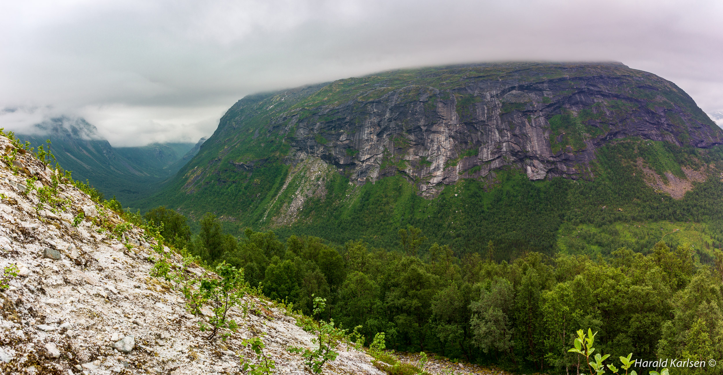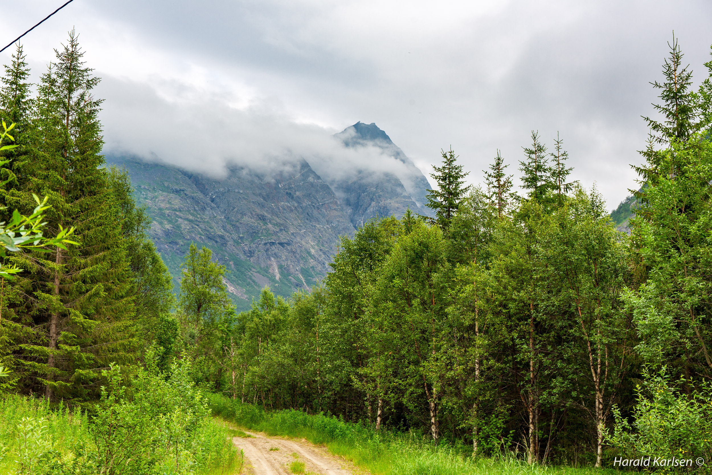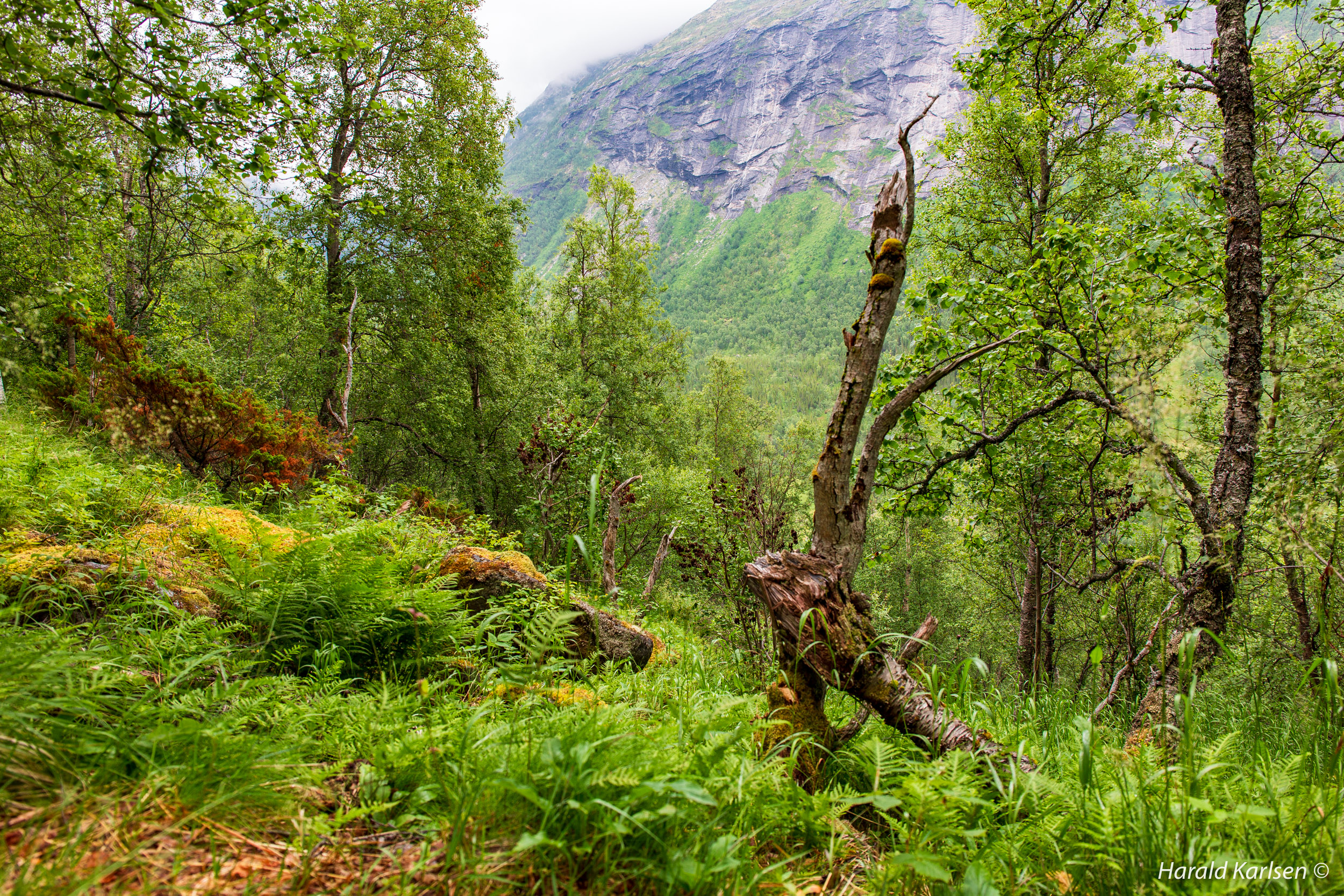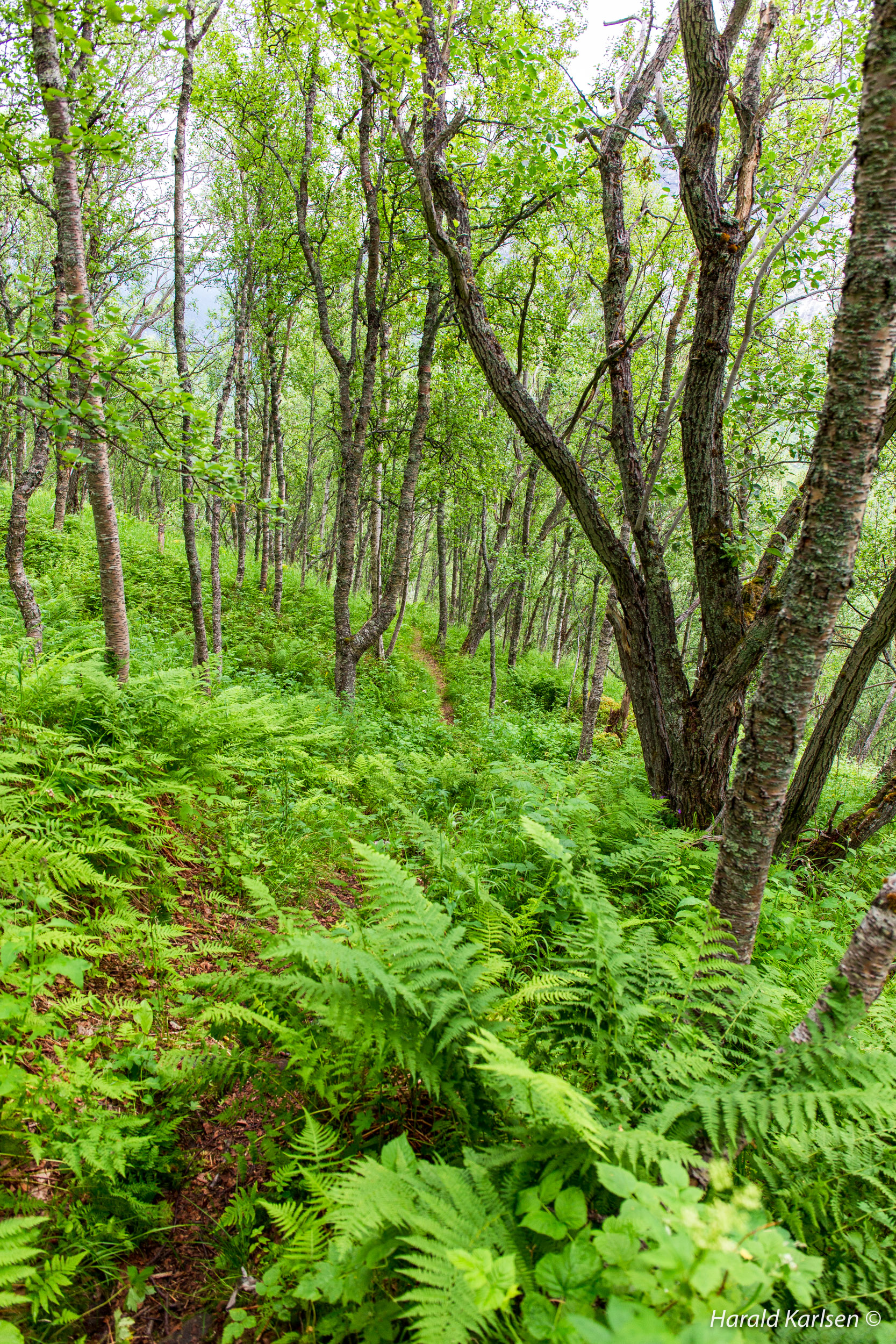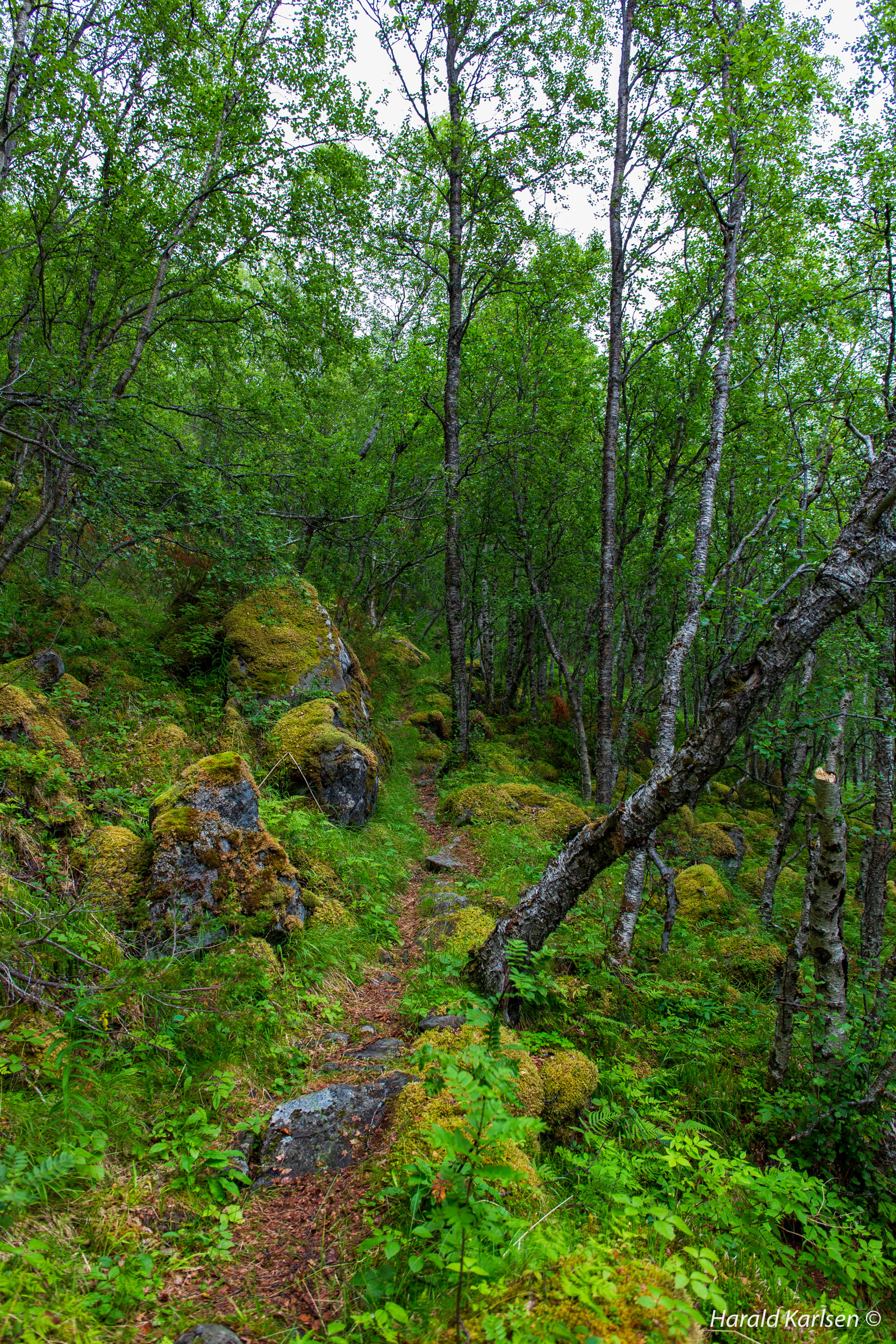 The trail winds up the mountainside in old birch forest.