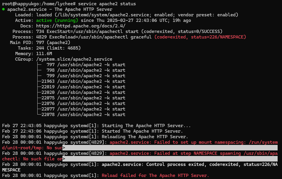 One of my website stopped working from time to time recently. and it was due to the apache2 process failing to reload due to "Namespacing" error. I can restart the apache2 to make it work, but the error didn't go away completely.