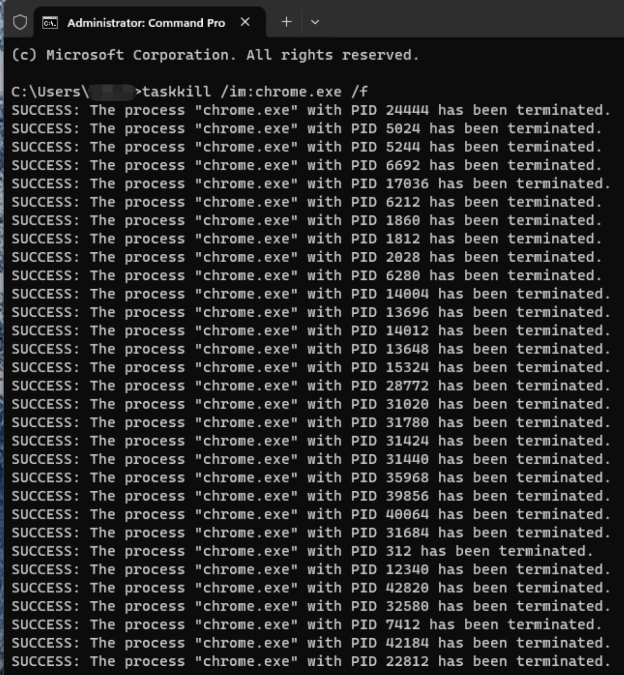 Then, I have terminated all the instances via the following command: `taskkill /im:chrome.exe /f" bear that in mind, you need the Administrator escalation.