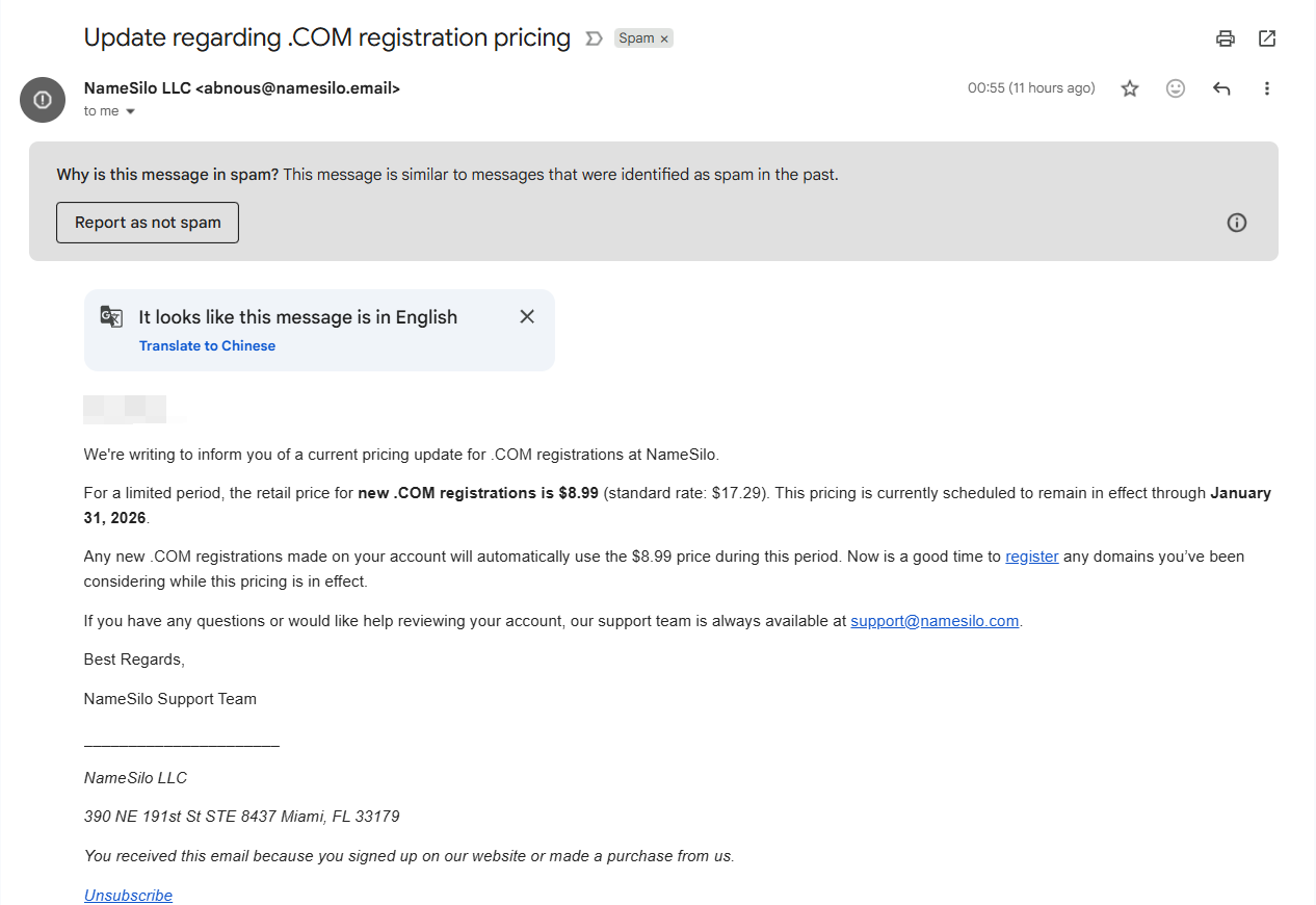 .COM registration pricing update on NameSilo
