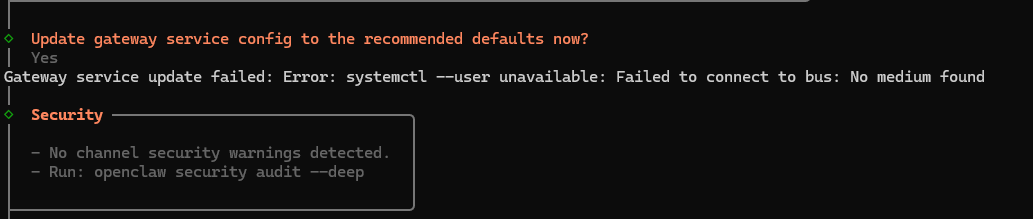 Gateway service update failed: Error: systemctl --user unavailable: Failed to connect to bus: No medium found
