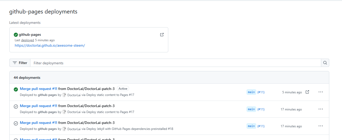 The deployment is said to be successful: https://github.com/DoctorLai/awesome-steem/deployments/github-pages