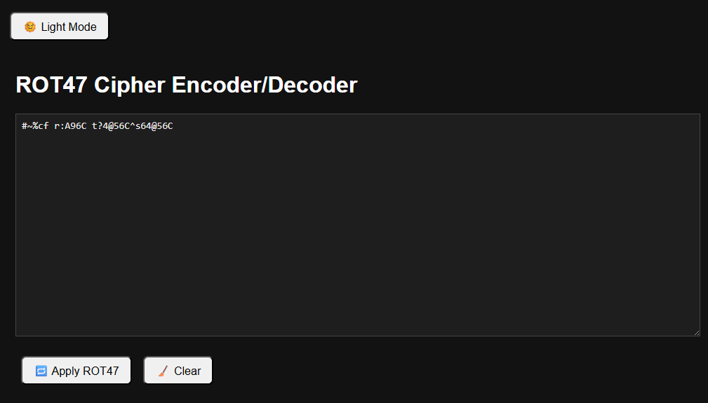 Here is a small tool that I find it useful. I usually google "ROT47 Cipher" and I realised that I could just make one and bookmarkit.