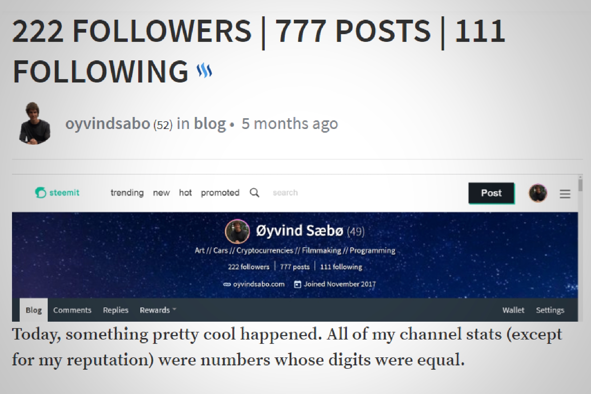 When I reached 222 followers, I published a post similar to this one. I used three months to get from 0 to 222 followers, and since then, I've used eight months to get to 666 followers. While those numbers aren't that impressive, it shows that I've managed to maintain a steady growth despite my occasional periods of inactivity.