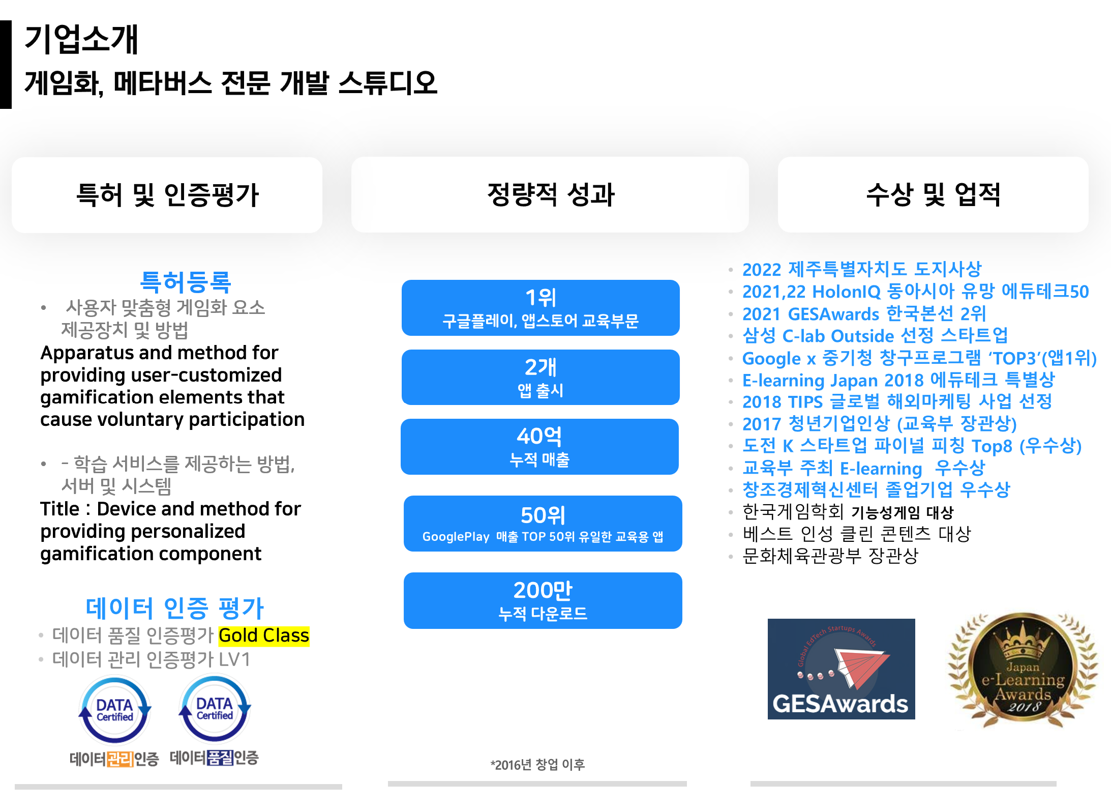 새로운 영역을 개척하며 국내외에 큰 조직, 행사로 부터 그 가능성을 인정받았습니다. 전체 TOP 50위 안의 유일한 교육용 앱으로 랭크 되기도 했으며, 네이버 앱스토에서 게임을 재치고 3주간 전체 1위를 하기도 했으며 구글 에디터스 초이스, 베스트앱 창구 프로그램 TOP3, 일본 이러닝 대회에서 최고의 에듀테크 업체, 글로벌 에듀테크 어워즈에서 한국 2위, HolonIQ 선정 동아시아 유망 에듀테크로 2년 연속 선정되기도 했습니다.