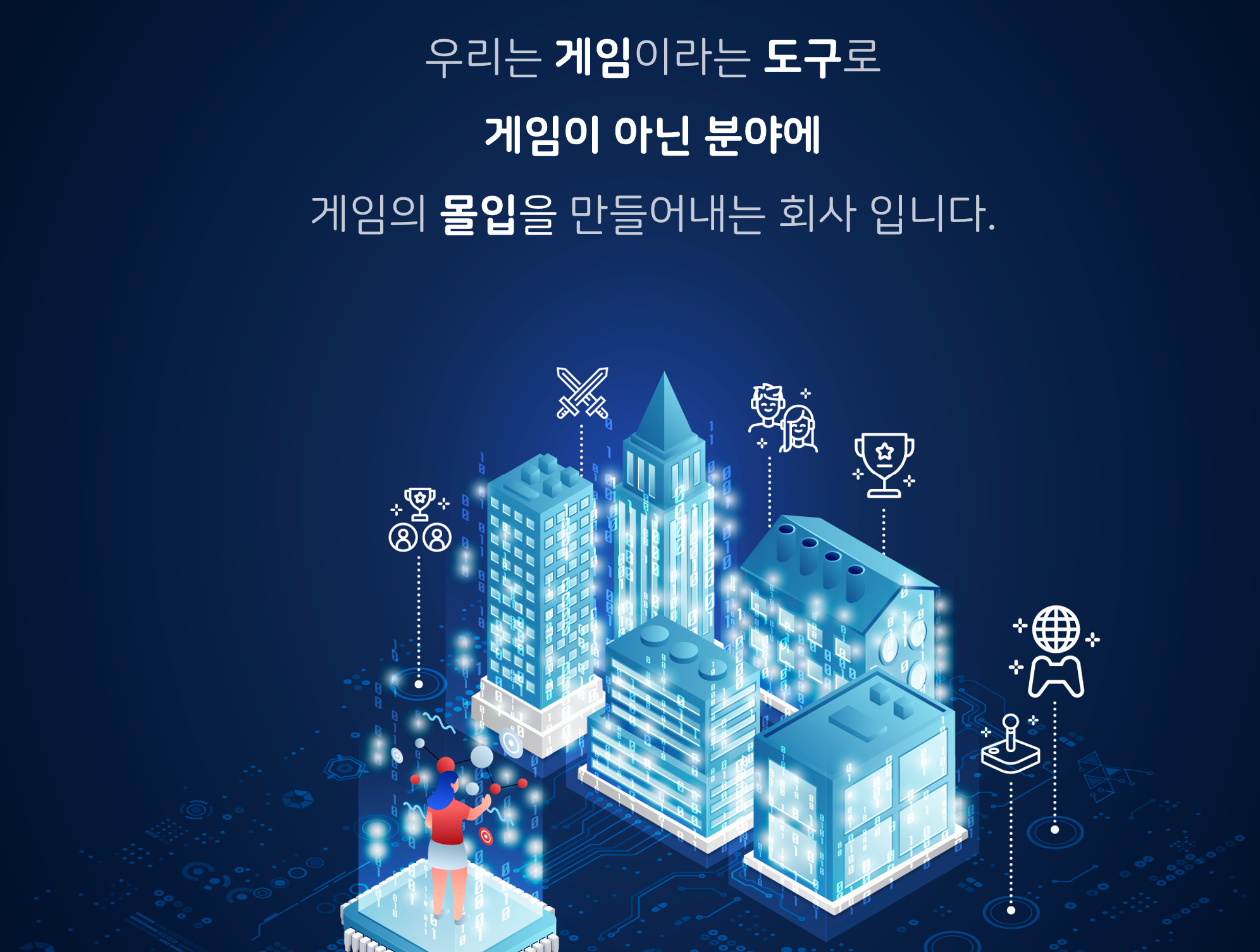 우리는 게임이라는 도구를 사용해서 게임이 아닌곳에 게임의 몰입을 만드는 회사 입니다.