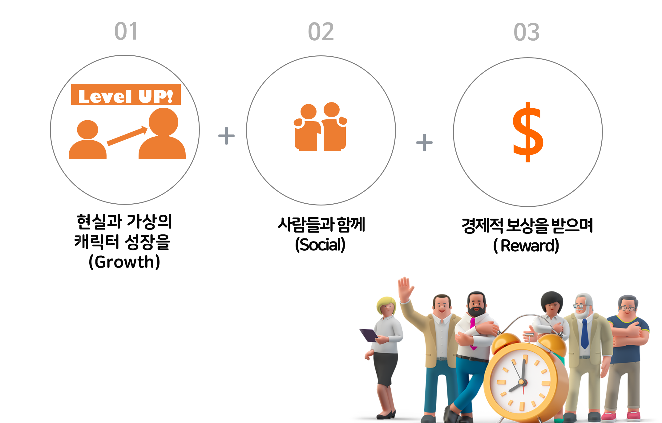 - 이부분의 솔루션을 게임적 매커니즘을 적용하여 "재미있는 성장" + "사람들과 함께" "경제적 인센티브" 라는 3가지 키워드로 풀어가려고 하고 있습니다.