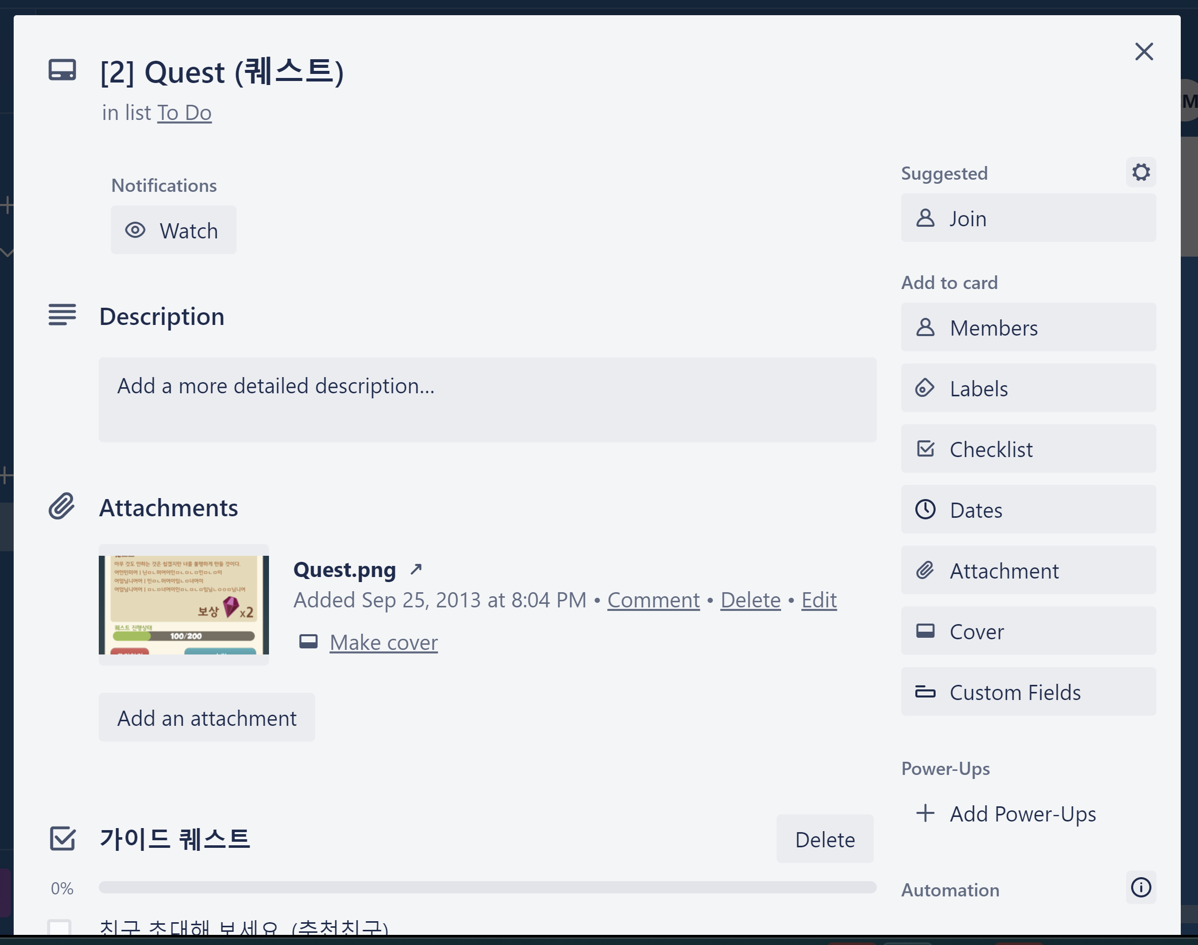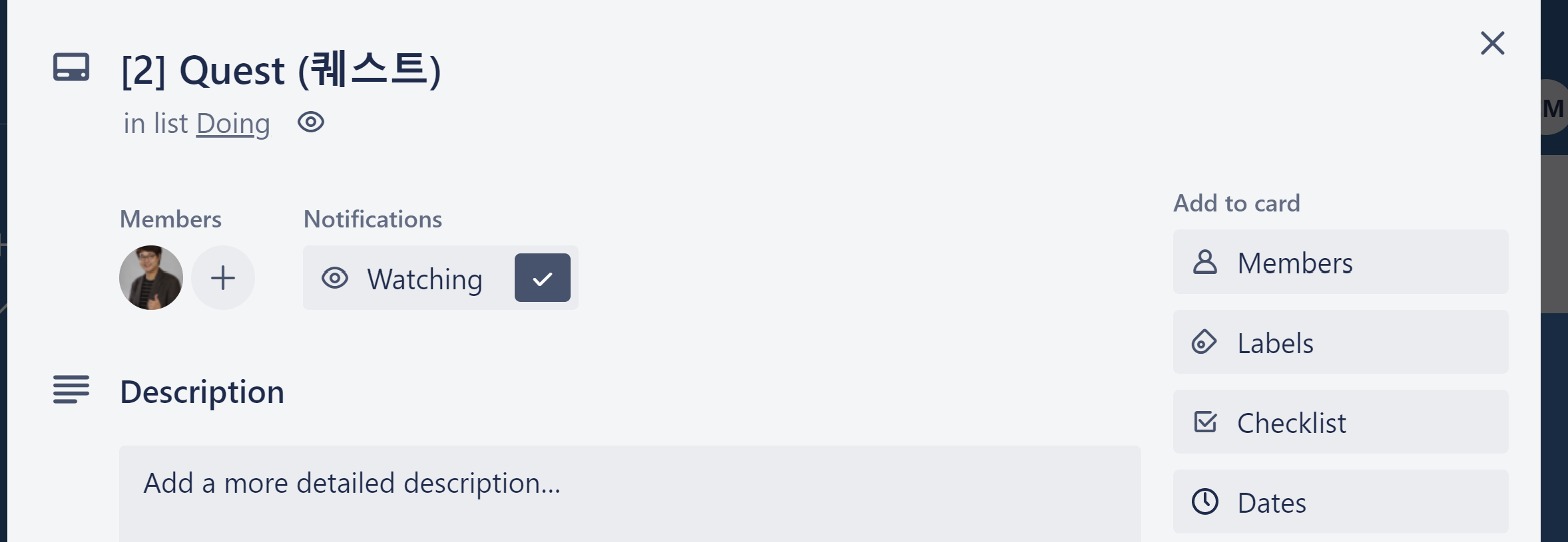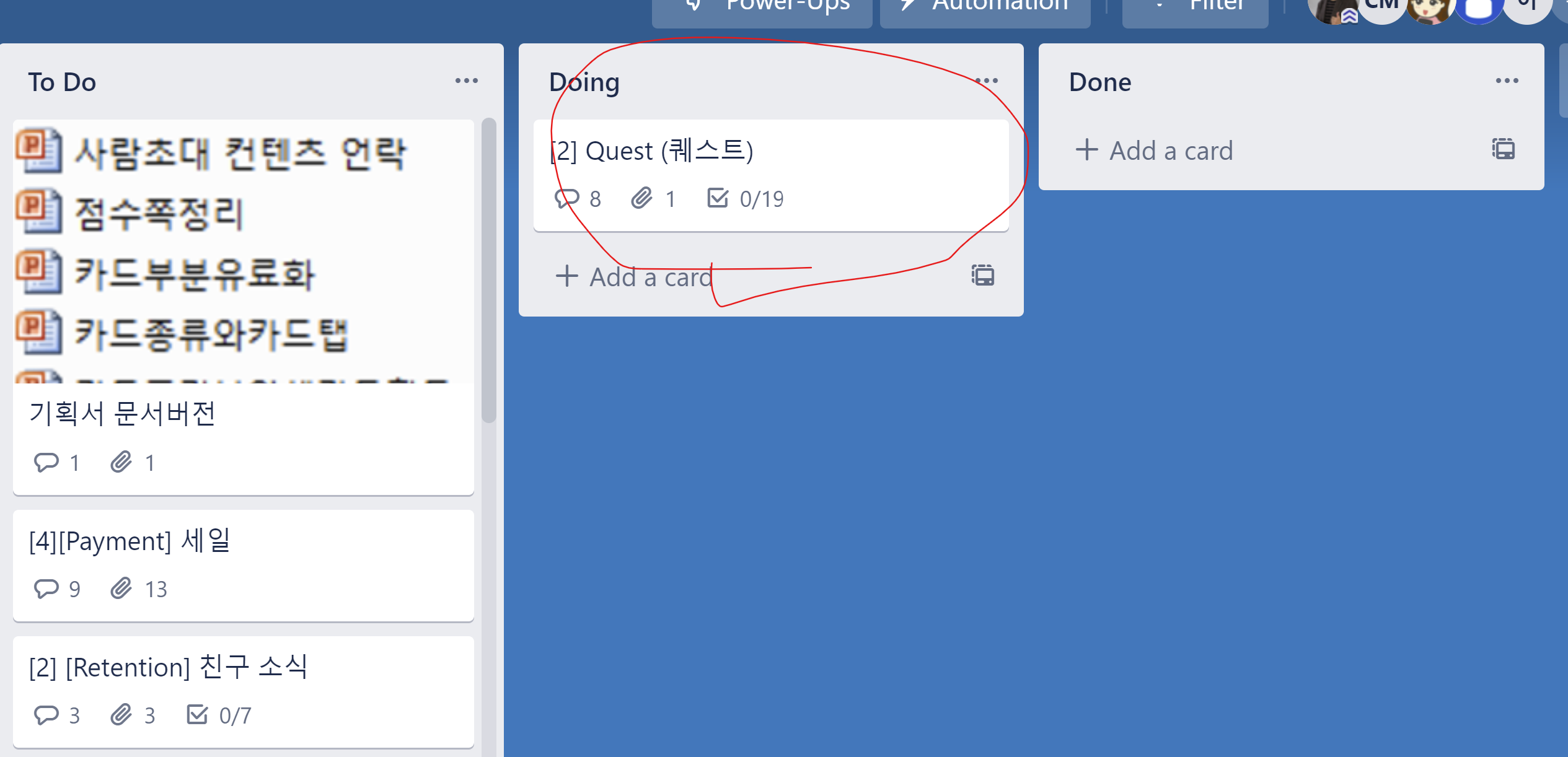 그리고 진행상황에 맞춰서 To Do, Doing, Done 이렇게 만들어 놓고 작업의 진행 상태에 따라서 자연스럽게 옮겨 주면 된다. 왼쪽에 ToDo 에 있던 [2]Quest (퀘스트) 카드가 오른쪽 Doing 으로 옮겨진것을 알 수 있다. 그냥, 드래그 앤 드랍으로 편하게 움직이면 된다.